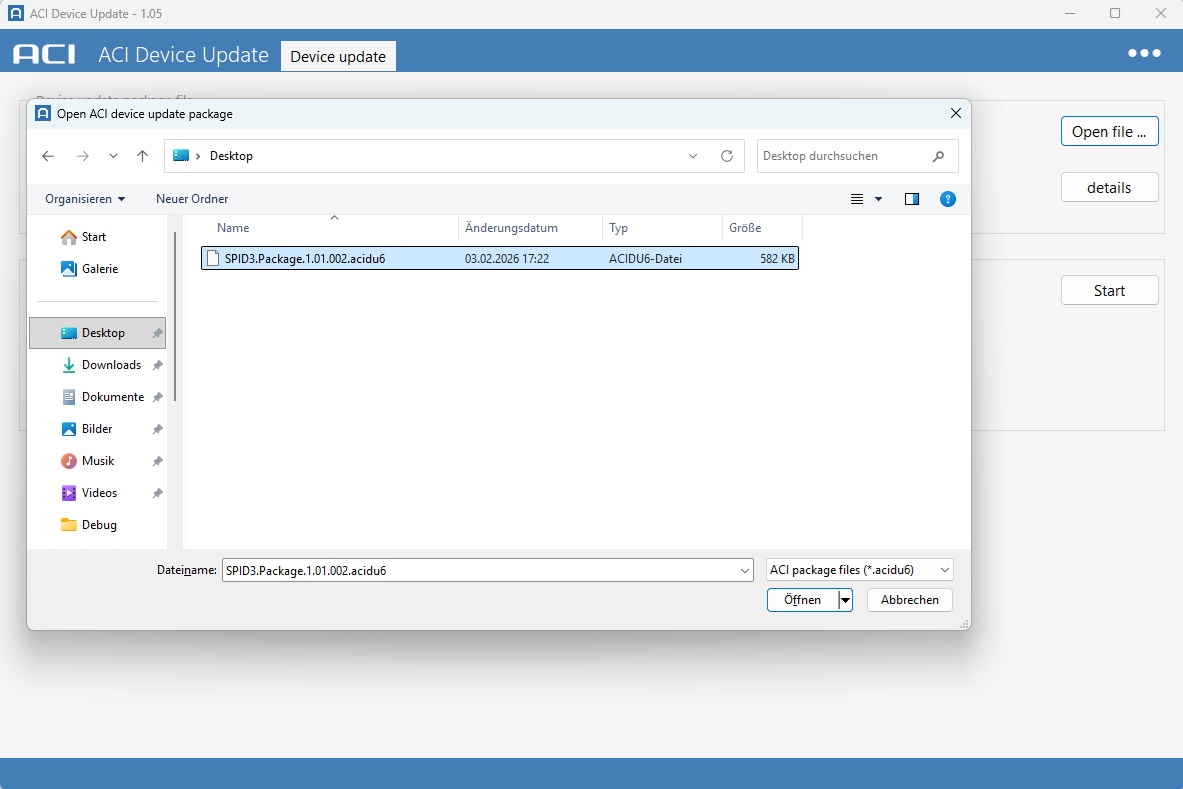 - Öffnen der Firmware Datei mit der Dateierweiterung "acifirm" im oberen Bereich des Programmfensters.